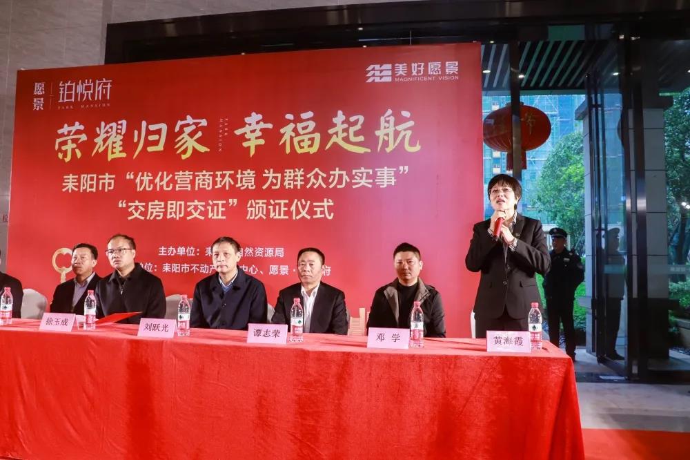 開發商代表黃海霞致辭,她簡述了該項目18年至今的發展歷程。房屋交付是考驗、責任、品質的實景兌現。“交房即交證”儀式能在耒陽首次順利舉辦,既離不開耒陽市政府和相關部門的大力支持和積極推動,同時也歸功于房產從業者們的堅守與付出。作為房產從業者,今后將會一如既往的支持與堅持“我為群眾辦實事”的實踐精神,積極履行交房交證的主體責任,加快交房進度,讓購房者放心收房、安心拿證。